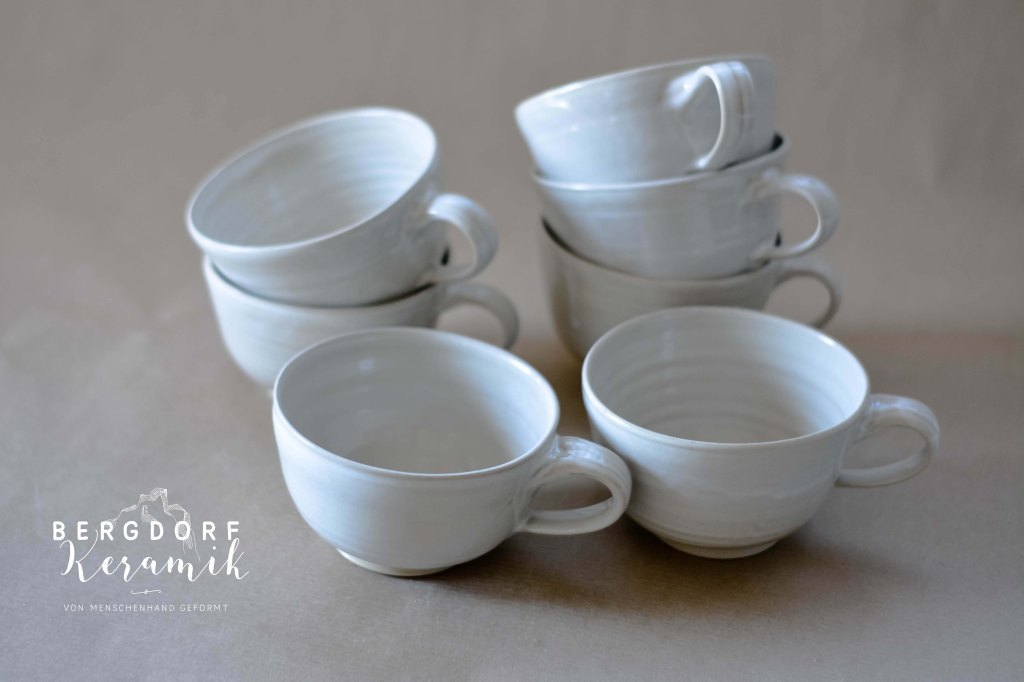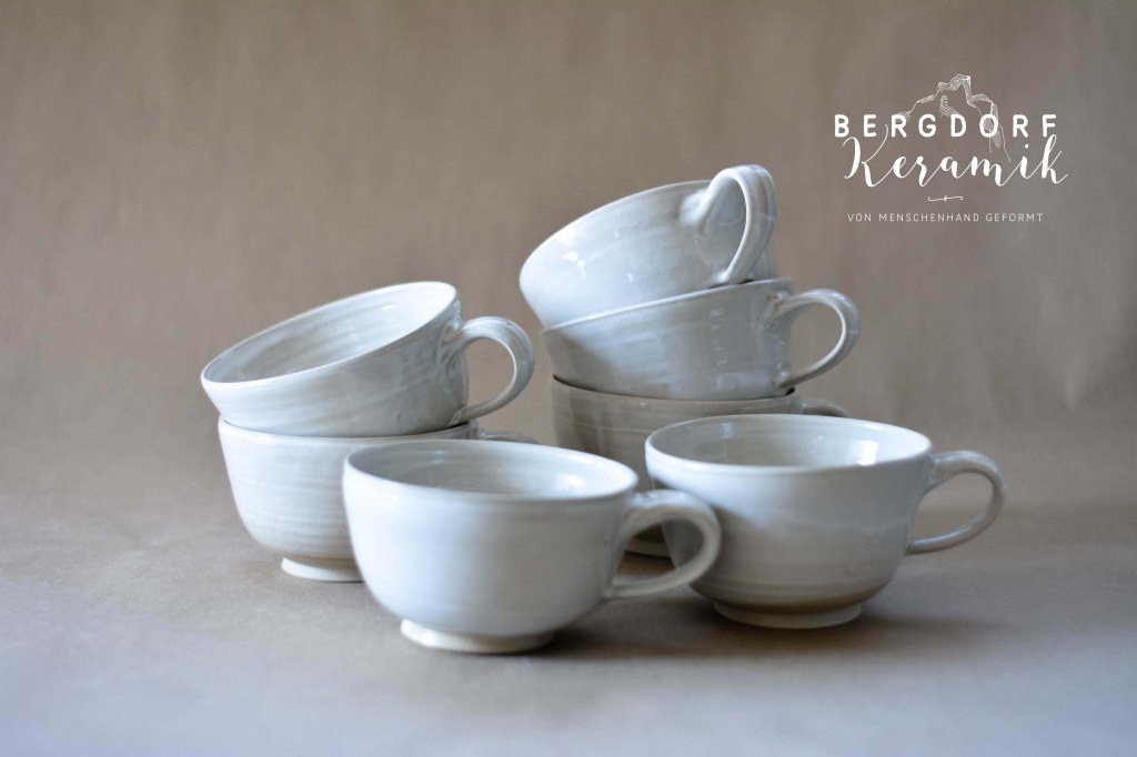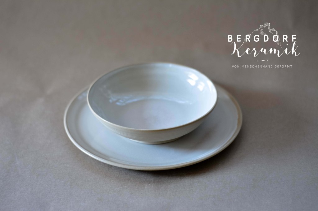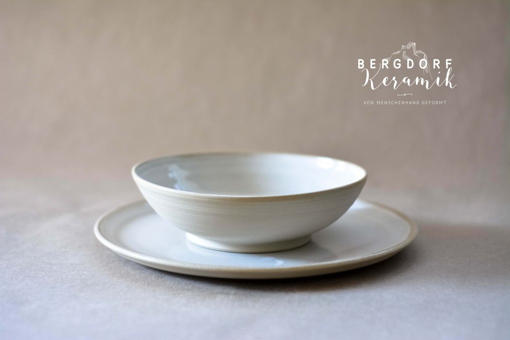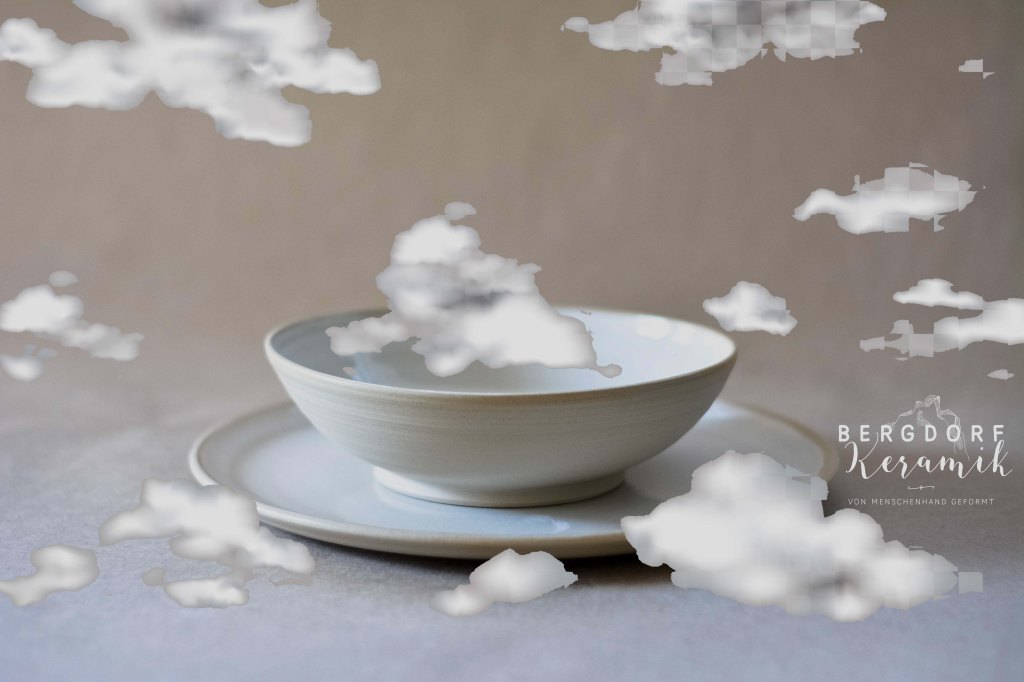 Die weiße Glasur mit kleinen transparenten Flocken wirkt wie vorüberziehende Wolken am Himmel. Der unglasierte naturfarbenen Tellerrand betont die natürliche Formensprache.