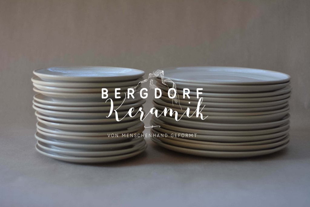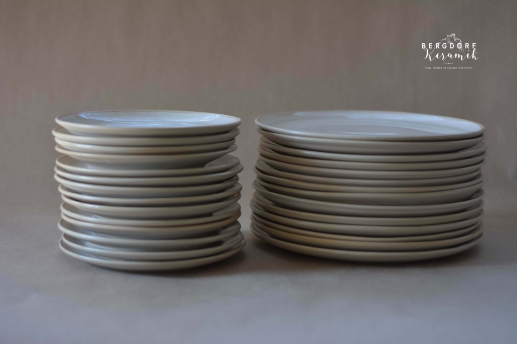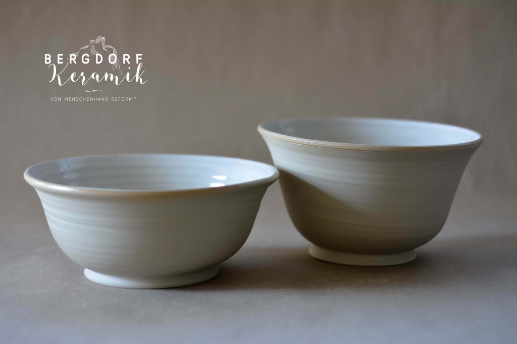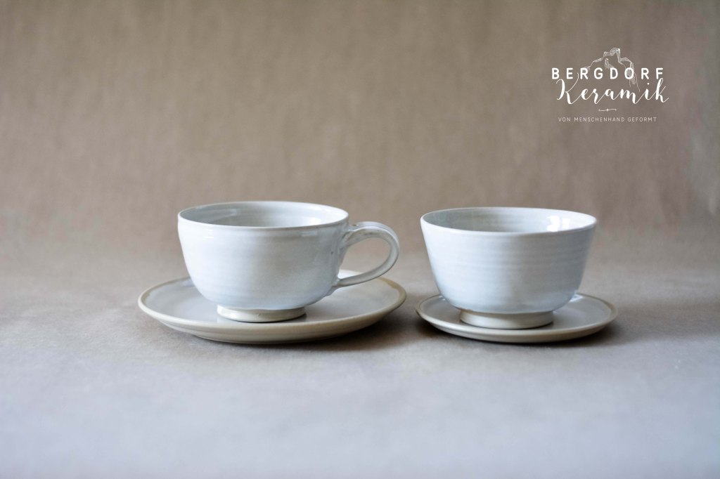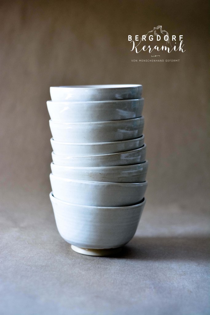 Die weiße Glasur mit kleinen transparenten Flocken wirkt wie vorüberziehende Wolken am Himmel. Der unglasierte naturfarbenen Tellerrand betont die natürliche Formensprache.